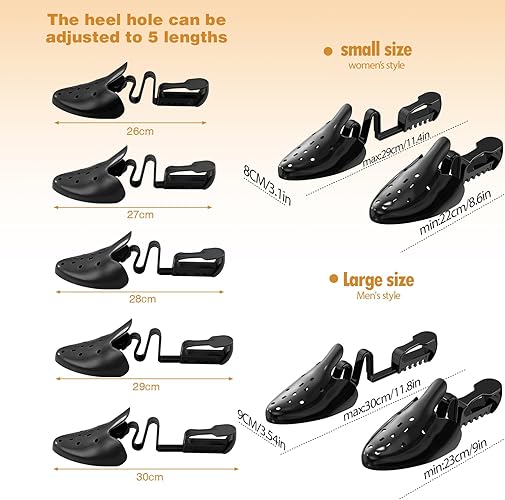 • 【Adjustability】The shoe stretcher is adjustable in length, the L size ranges from 9.05 inches to 12.5 inches (23 cm to 30 cm), suitable for men's shoes size 5.5 to 11; the M size ranges from 8.46 inches to 11 inches (21.5 cm to 28 cm), suitable for women's shoes size 5 to 11; to meet the shape requirements of different styles of shoes, whether it is leather shoes, sports shoes, etc