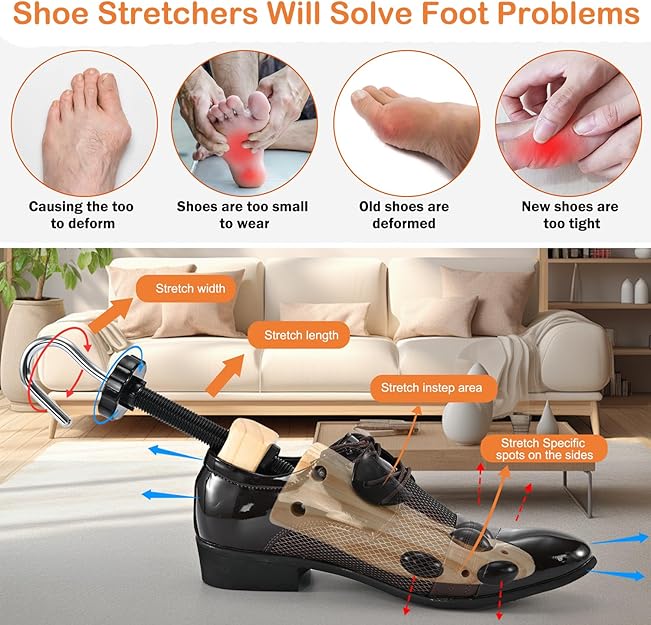 【4-Way Adjustable Wooden Shoe Stretcher】The shoe stretchers provides 4-way stretch: stretch width to widen shoes; stretch length to increase shoe size; expand bunion area; lift vamp or upper. Shoe stretcher for women will turn any pair of shoes into a perfect fitting, comfortable shoe. The shoe expander will save your wide feet from many blisters and pain